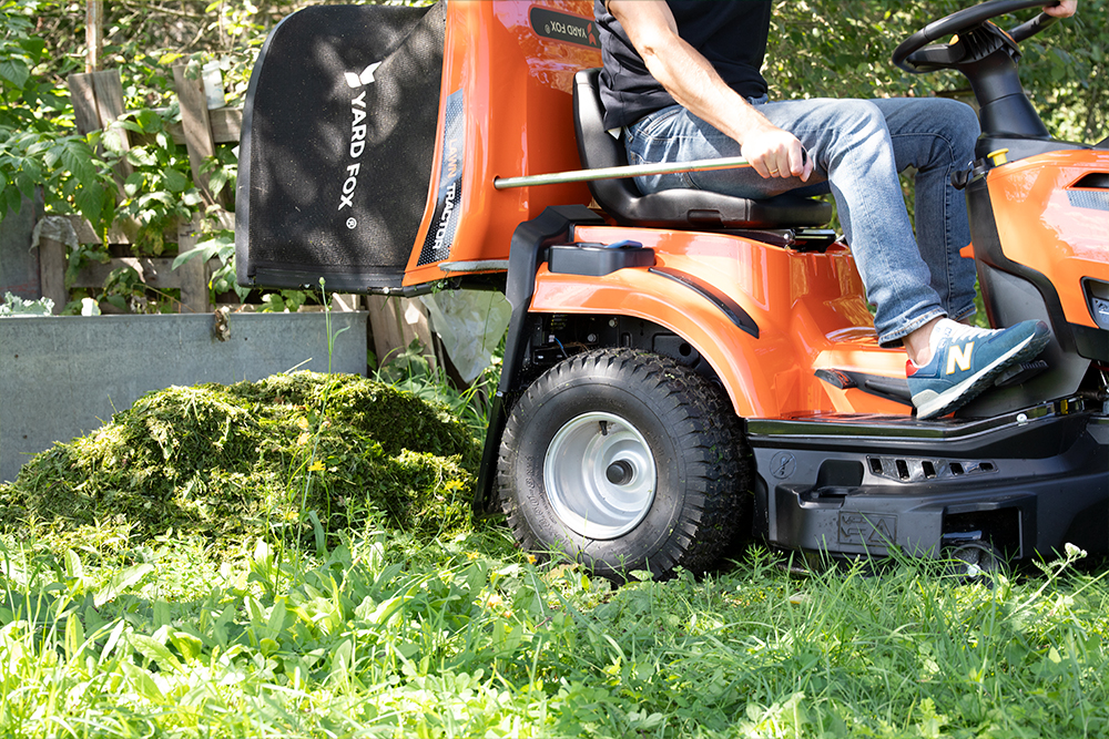 На фото: у травосборников в тракторах YARD FOX звуковой индикатор заполнения и ручка для опустошения с места